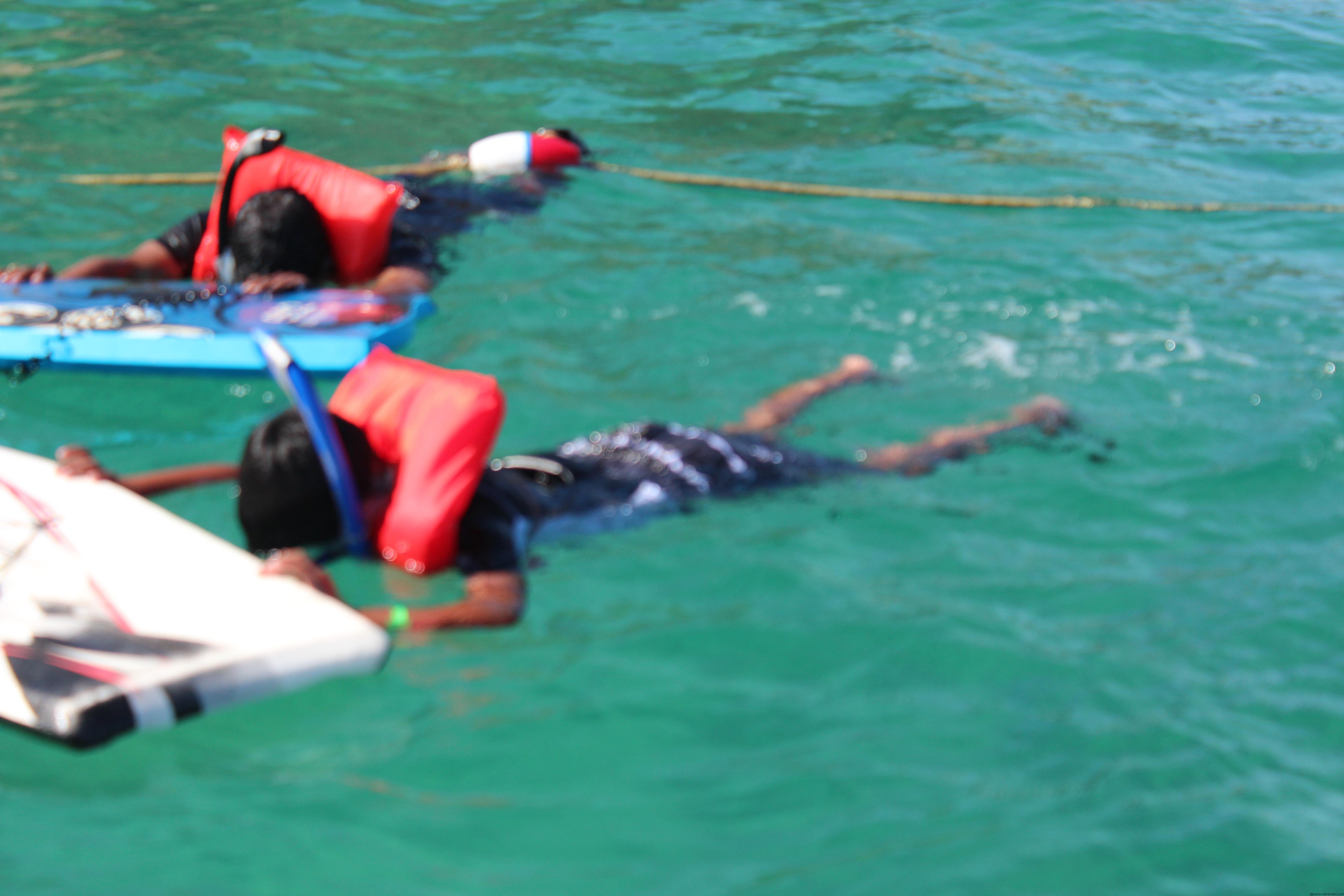 After the whale watching we headed towards the lovers beach area to do the snorkeling. Gayathri, Karthik & I decided to stay on the boat while Mani & the kids got their swim suits along with the snorkel gear all worn & ready to get into the water. The captain accompanied Mani & the kids helping them to get comfortable in the water. Mani initially had discomfort with the surf board and was constantly going into the back float mode. Finally he got his rhythm and was in full swing snorkeling. As I did not snorkel this time, I came to know that they were able to see plenty of beautiful fishes but the coral reefs were not seen in the place we snorkeled. The water color was also very beautiful in its greenish blue color.